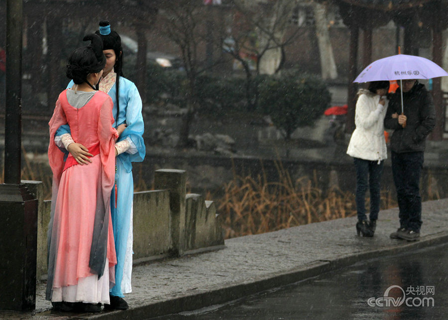 A couple wearing ancient costumes poses for photo near the West Lake in Hangzhou on Feb. 10, 2012. (Photo/CNTV)