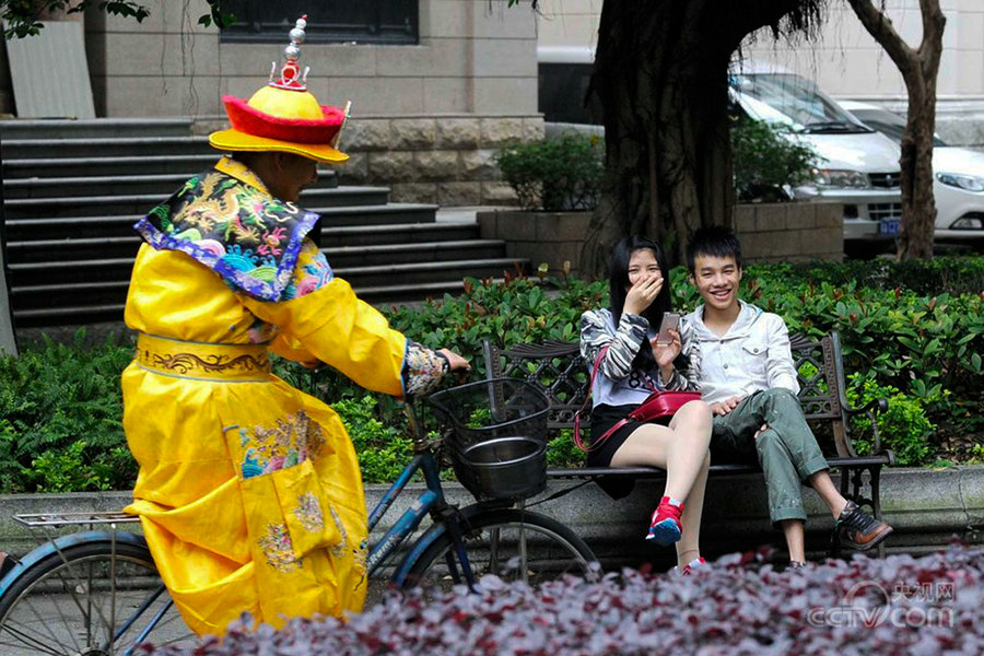A man dressed in Qing emperor costume rides a bicycle in the street in Guangzhou, south China’s Guangdong province on April 8. 2014. He told the spectators that he came from the Forbidden City in Beijing. (Photo/CNTV)
