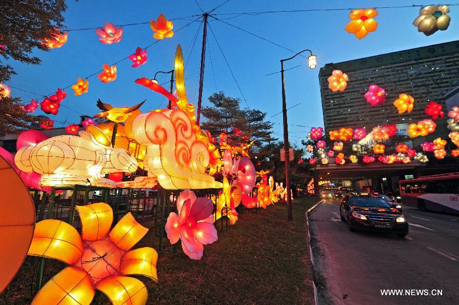 Lanterns light up the street for the Mid-Autumn Festival media preview in Singapore's Chinatown, Aug. 19, 2014. (Xinhua/Then Chih Wey)