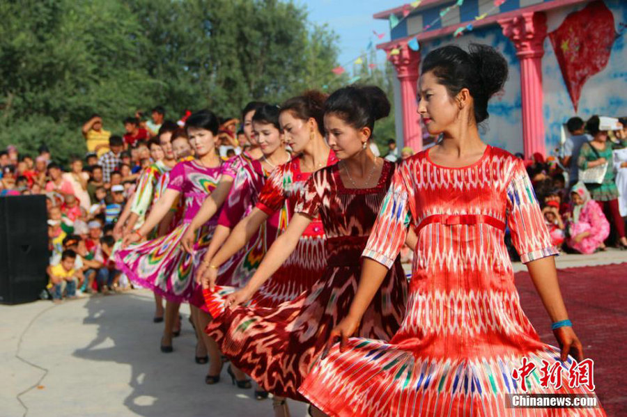 Farmers and herdsmen display ethnic costumes in Yaha town of Kuqa county, Xinjiang on Aug. 20, 2014. (Chinanews/Fan Hongying)