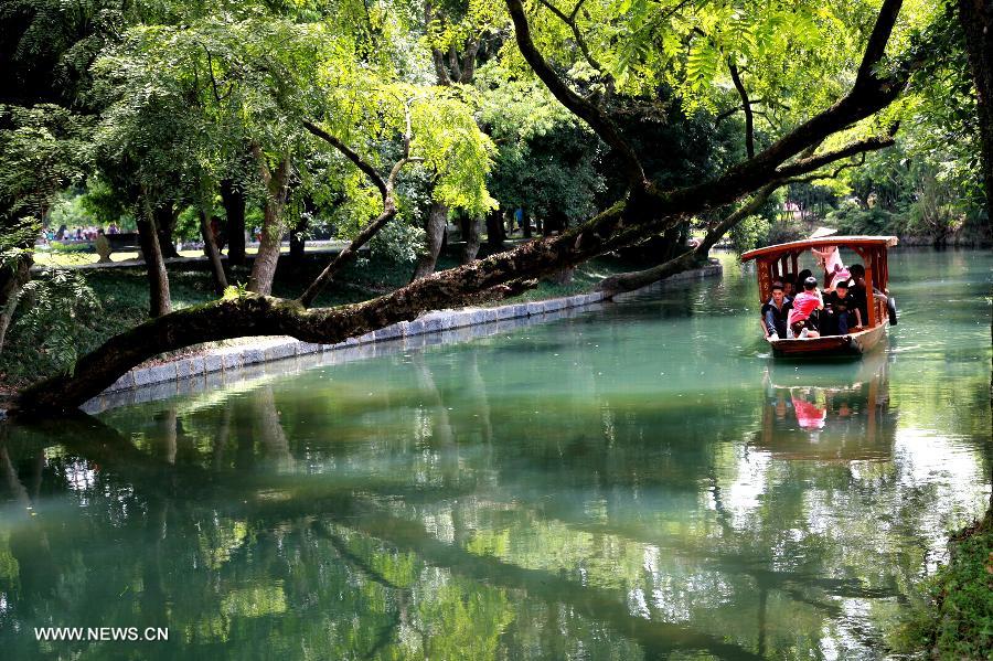 Tourists go sightseeing at the Ling Qu Canal in Xing'an county, southwest China's Guangxi Zhuang Autonomous Region, Aug. 23, 2014. Built in the Year 214 BC, the Ling Qu Canal is one of the oldest canals in the world which links the Xiangjiang River and Guijiang River to form a north south waterway of the region. [Photo/Wang Zichuang]