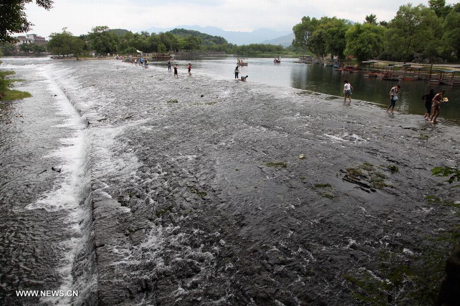 Tourists go sightseeing at the Ling Qu Canal in Xing'an county, southwest China's Guangxi Zhuang Autonomous Region, Aug. 23, 2014. Built in the Year 214 BC, the Ling Qu Canal is one of the oldest canals in the world which links the Xiangjiang River and Guijiang River to form a north south waterway of the region.[Photo/Wang Zichuang]