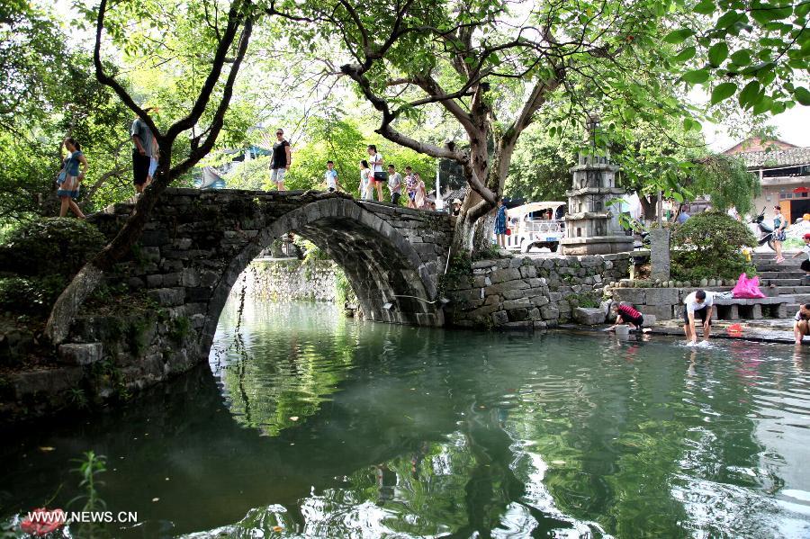 Tourists go sightseeing at the Ling Qu Canal in Xing'an county, southwest China's Guangxi Zhuang Autonomous Region, Aug. 23, 2014. Built in the Year 214 BC, the Ling Qu Canal is one of the oldest canals in the world which links the Xiangjiang River and Guijiang River to form a north south waterway of the region.[Photo/Wang Zichuang]