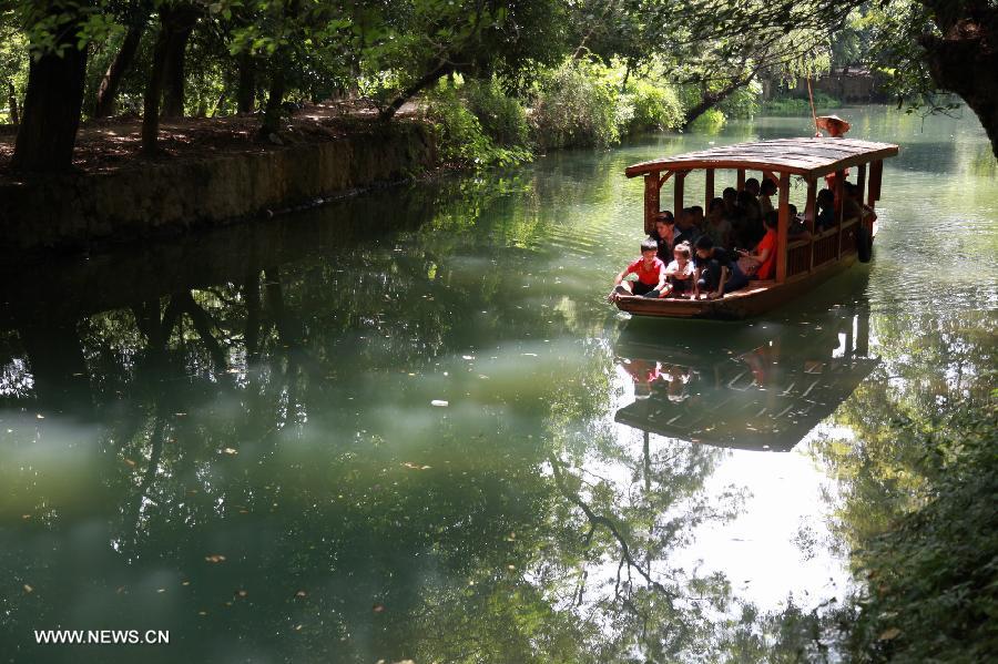 Tourists go sightseeing at the Ling Qu Canal in Xing'an county, southwest China's Guangxi Zhuang Autonomous Region, Aug. 23, 2014. Built in the Year 214 BC, the Ling Qu Canal is one of the oldest canals in the world which links the Xiangjiang River and Guijiang River to form a north south waterway of the region.[Photo/Wang Zichuang]