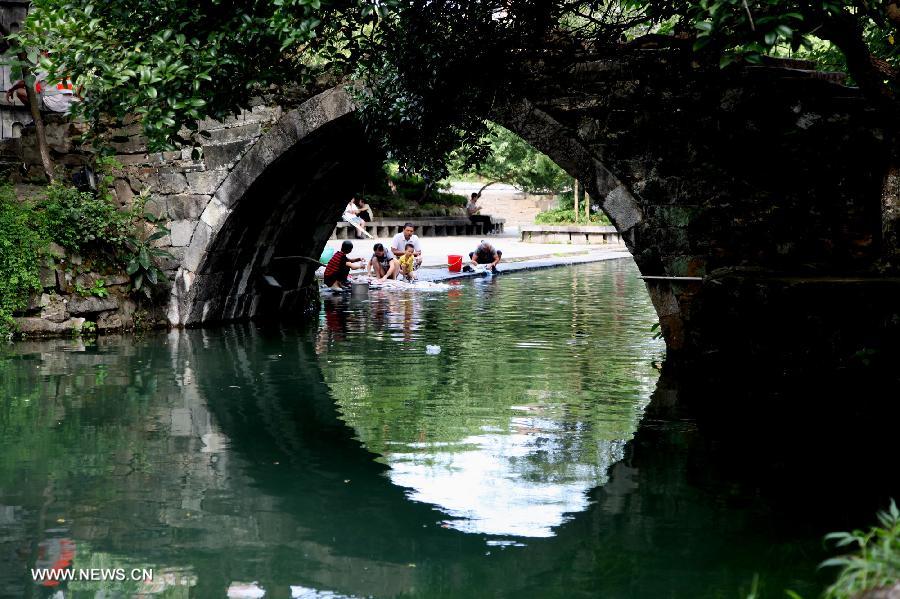 Photo taken on Aug. 23, 2014 shows a stone arch bridge over the Ling Qu Canal in Xing'an county, southwest China's Guangxi Zhuang Autonomous Region. Built in the Year 214 BC, the Ling Qu Canal is one of the oldest canals in the world which links the Xiangjiang River and Guijiang River to form a north south waterway of the region.[Photo/Wang Zichuang]