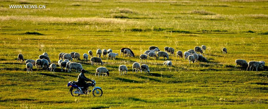 A man shepherds on the grassland of Hulun Buir, north China's Inner Mongolia Autonomous Region, Aug. 22, 2014[Photo/Ren Junchuan]