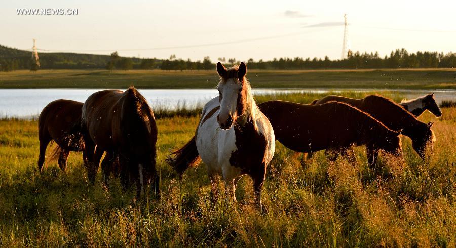 Horses eat on the grassland of Hulun Buir, north China's Inner Mongolia Autonomous Region, Aug. 21, 2014..[Photo/Ren Junchuan]