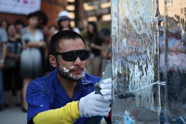Liu Yang shows off his sculpting skills in creating an ice sculpture at his book-launch ceremony in Beijing. [Photo provided to China Daily]