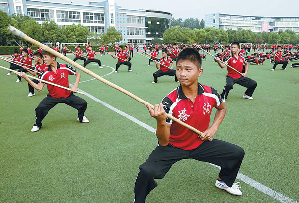 Students from the Shaolin Tagou Martial Arts School training in Nanjing, capital of Jiangsu province, on Aug 5. Wang Song / Xinhua