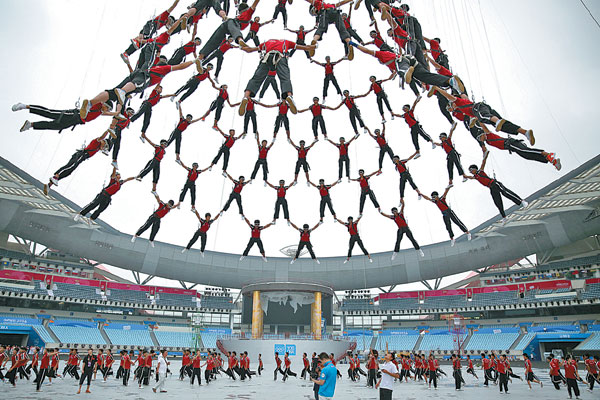 Performers from the Shaolin Tagou Martial Arts School rehearsing on Aug 9 for the 'Build the Dream' show in the opening ceremony of the Nanjing Youth Olympic Games. Chen Xiaodong / For China Daily