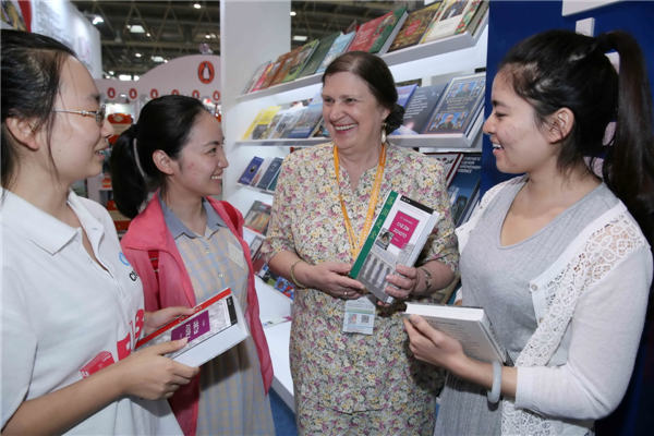 Chinese readers talk with a Russian author at the booth for Russia during the fair. Photo by Chen Xiaogen/China Daily