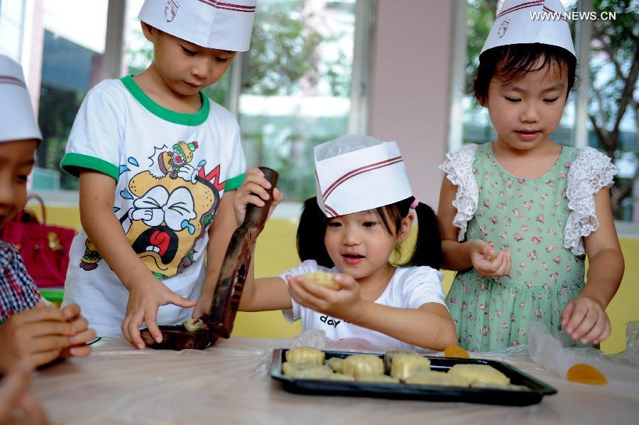 Children use moulds to make mooncakes in Hefei, capital of east China's Anhui Province, Sept. 4, 2014. The Mid-Autumn Festival, which falls on Sept. 8 this year, is a traditional Chinese festival for family reunions, during which folks will enjoy the full moon together and eat mooncakes - small round pies with a variety of fillings. [Photo/Xinhua]