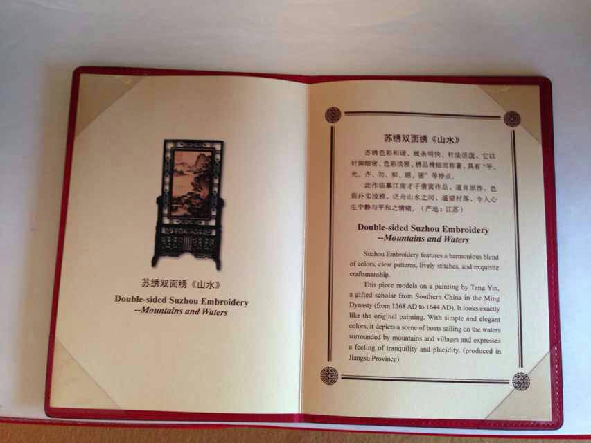 The introduction in both Chinese and English for a piece of double-sided Suzhou embroidery artwork given by Chinese President Xi Jinping as a gift to Indian Prime Minister Narendra Modi on September, 17, 2014. [Photo: CRIENGLISH.com]