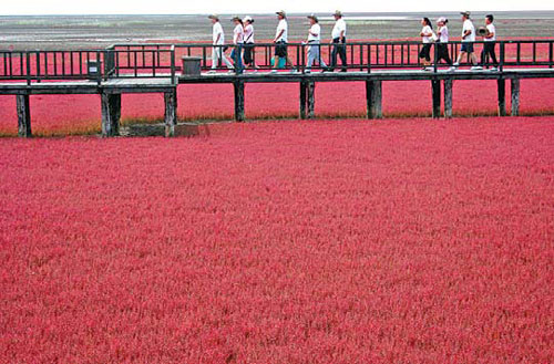 Each autumn the wetland in the Liaohe River Delta in Panjin, Northeast China's Liaoning province, is covered by a special seasonal red plant. Tourists can walk on trestles above the marshland to enjoy the splendid "red carpet" extending an area of 60 sq km. In October the plants turn on a deep red hue. You're also likely to spot quite a few rare birds there.