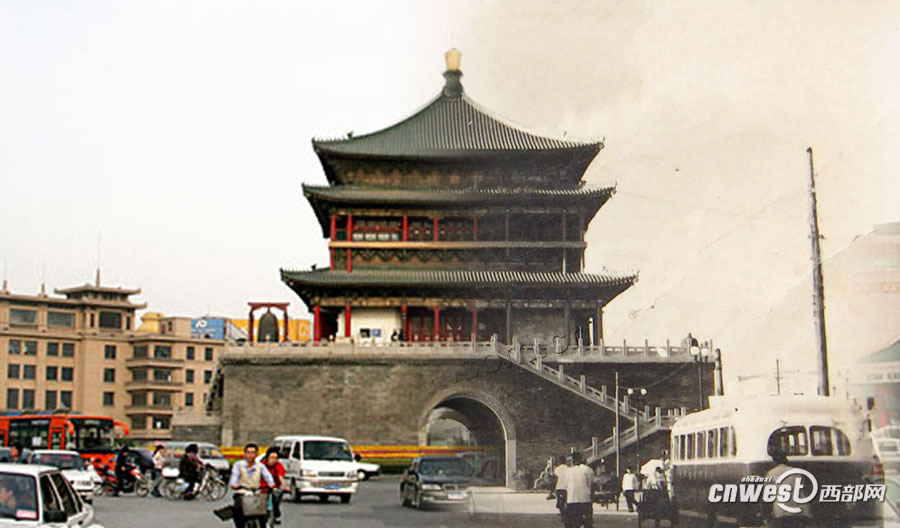 Bell Tower at present and in the past. The Bell Tower in Xi'an was built in 1384 during the early Ming Dynasty. Located at the center of the city, it is a symbol of Xi'an and one of the grandest of its kind in China. [Cnwest/Li Gaofeng]