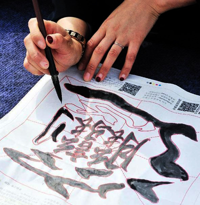 A participant writes Chinese character "biang" during a Writing "Biang" event held in Xi'an, capital of Northwest China's Shaanxi province, April 13, 2014. Used in the name of Biangbiang noodles, a popular type of noodle in Shaanxi, the 57-stokes Chinese character "biang" is one of the most complex Chinese characters in contemporary usage. [Photo/Xinhua]