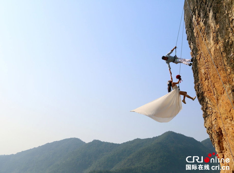 On October 26, 2014, a climbing fan and his wife climb to a 20-meter-high cliff to take their wedding photos in Jinhua, east China’s Zhejiang Province. [Photo/cri.cn]