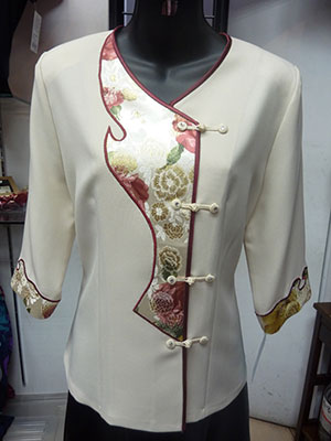 Then we can choose to have clothing 量身定做 (liàng shēn dìng zuò), made to measure, by a 裁縫 (cái feng), tailor. If you prefer a more traditional costume you can choose a 中山裝 (Zhōng shān zhuāng), literally Sun Yat-sen suit (known more commonly in the West as a jacket with mandarin collar), or the 唐裝 (Táng zhuāng), Tang suit. The fabric can be made even more elaborate with 刺繡 (cì xiù), embroidery. Both are considered 晚禮服 (wǎn lǐ fú), evening wear, but not quite equal to the three-piece 西服 (xī fú), Western suit.