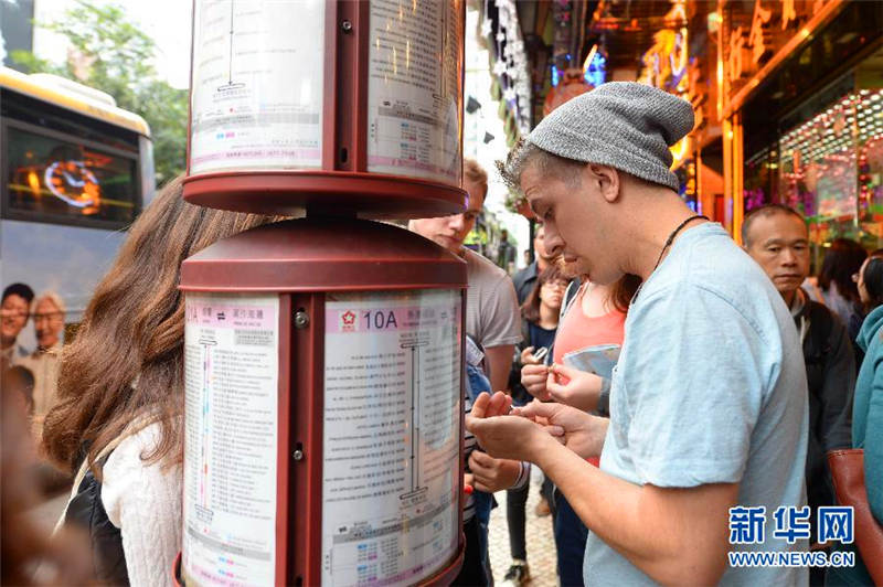 A tourist looks at the bus stop board on Macao's main avenue, San Man Lo, Dec 6, 2014. [Photo/Xinhua]