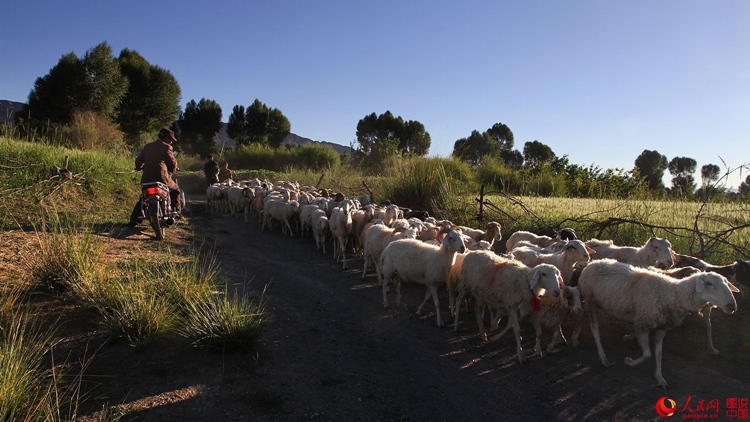 A herder keeps the sheep together in a flock on an open range in Ngawa Tibetan and Qiang autonomous prefecture.[Photo/chinapic]