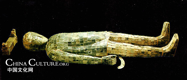 Liu Sheng's was made of 2498 pieces of jade, sewn together with 1.1 kilograms of gold thread. Each suit consists of 12 sections: face, head, front, and back parts of tunic, arms, gloves, leggings, and feet.