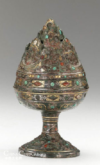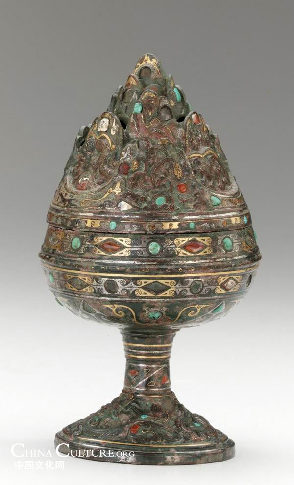 Gold dragons emerge from the openwork foot to support the bowl of the burner. The bowl is decorated with a pattern of swirling gold inlay suggestive of waves. The lid of the burner is formed of flame-shaped peaks, among which are trees, animals, and immortals. There are many tiny holes in the peaks.