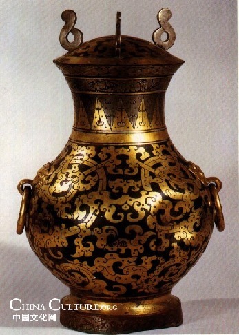 The body of the vessel is gilded with silver and gold. The pot is decorated with elegant patterns of clouds at its mouth and foot, triangle strips at the neck and intertwined gold dragons at the belly. The inner is painted with red lacquer to prevent erosion.