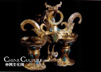 The neck, belly and surface of the cups are inlaid with 13 pieces of round or heart-shaped turquoise. Inside the cups traces of red materials were found at the time of excavation which the experts believed to be cosmetics.