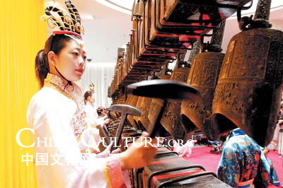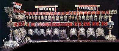The most attractive chime bells were excavated from marquis Zeng's tomb of the Warring States period. They consisted of 64 bells and were suspended from three different layers of a rectangular shelf. The first layer consisted of 19 suspended bells while the second and third layers were 45 suspended bells in total. All the bells were exquisite and performed well, and it has been the biggest band consisting of bells and drums so far.