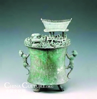A copper ware holding sacrificial utensil of Dian Minority Group and two tigers pattern unearthed in Jinning ,Yunnan Province.
