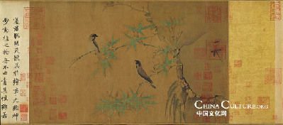 In spite of being a total failure in running state and military affairs, Huizong is probably one of the greatest patrons of art any nation ever had. Not only a great patron of art but without doubt a great artist himself, he excelled in painting birds and flowers and also produced worthy poetry. His paintings are considered to be China’s greatest surviving masterpieces and his fine reproduction of Zhang Xuan’s 'Court Ladies Preparing Newly-Woven Silk' is the only surviving copy of this great Tang masterpiece. His unique calligraphy became an independent style known as the “Slender Gold” style (Shou Jin Ti). The name "Slender Gold" came from the fact that Huizong's writing resembled gold filament, twisted and turned. This style of calligraphy is a sharp diversion from anything seen before and in a way demonstrates that although Huizong was not very courageous in the battle field, he certainly had the courage to innovate in the field of aesthetics. His calligraphy, even more celebrated than his painting, is extremely unconventional and original, the strokes are stretched to their extreme limits and the result is a fascinating dynamism that until today stands out as an independent and striking interpretation of Chinese characters.