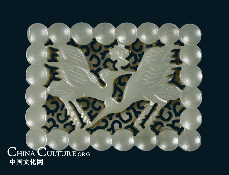 This semi-transparent ware is made from white jade. The dragon figures are in an “s” shape, with delicate images carved onto their bodies. Between the two dragons is the jade Bi, which is engraved with swirl-figured patterns on both sides, making the jade ware more harmonious.