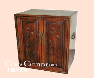 This is a mobile book chest used by scholars when they traveled. Normally for scholars from wealthy families, they would have a young “book boy” who carried the book chest around for them. For those who couldn’t afford a “book boy”, they would carry the chest themselves. You will see a C-shape ring on each side of the side panel, and special strings or leather would be used to go around these rings and the top of the chest when carried on the back of the book boy. The door panels are decorated with low relief carvings of bamboo.