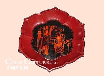 This type of lacquer plate is also called Tsang Pun – meaning fruit plate. It is used for important occasions such as weddings and ancestor worshipping ceremonies to hold fruit and snacks. This plate is in the shape of lotus blossom. The process of producing such a lacquer plate is tedious and includes a lot of work. Each petal is individually carved from a solid panel and then metal is used to bind each individual carved panel together. The painting is done in the Miao Jin method. Many layers of thin lacquer are applied to the wood and then careful finishing is performed to bring about the smooth surface.