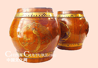 This pair of rice containers is made in the form of a round barrel. The surface is lacquered and gilt painted with gold and black lacquers. The theme of the painting is a peacock which is a symbol of prosperity. Near the top and close to the bottom it is painted in gold lacquer with black dots. The dots represent the head of the nails found in real leather drums. Hence this type of rice container is also called the drum shaped containers.