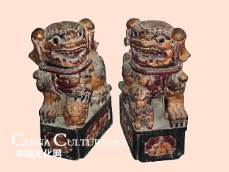 This pair of lions stands on a wooden base with relief carving decoration. The wood is decorated with gold and green lacquer. The circular form of these lions project a sweeter and friendlier image compared to the fierce look of Northern lions. The expression of the pair represents joy and luck.