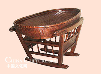This baby cradle is made of a large bamboo basket with a stand. The basket is put on the stand and can be rocked back and forth.