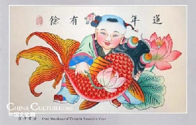 One main variety is the chubby and lovely babies with either lotus in their hands or carps in their arms. The picture Liannianyouyu features a boy holding a lotus in his hand and a goldfish in his arms. “l(fā)ian“ in “l(fā)ianhua“ (lotus) stands for its homophone “l(fā)ian“ in “l(fā)iannian“( successive years) and “yu“ (fish) for its homophone “yu“ (surplus). Taken together, “l(fā)ianianyouyu “gives the meaning of “enjoying prosperity year after year.
