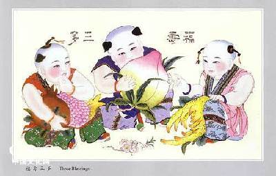 Traditional New Year pictures made by the block printing method are characterized by simple, clear lines, brilliant colors and scenes of prosperity. The method consists of several steps: drawing and tracing, block engraving, printing, coloring and mounting. The finished pictures, therefore, have the features of both woodcut prints and Chinese paintings, constituting a special branch in traditional folk art.