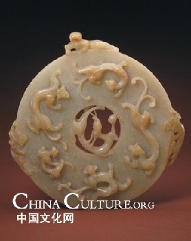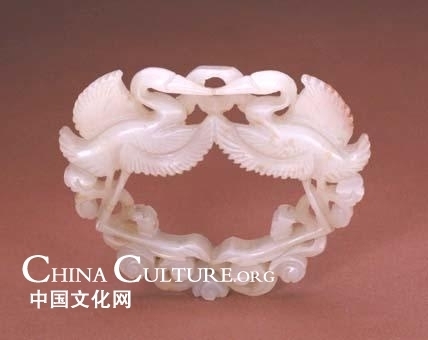 White with cyan sheen, the jade ornamentation was smooth textured with grease-like luster. Two connecting cranes formed a circle in general shape, face to face, claws to claws, and they were spreading their wings as if to soar away. On the top there was a little hole for thread to be fastened to clothes. Cranes are seen as an auspicious sign in Taoism, to which Emperor Huizong of the Song was an adherent.