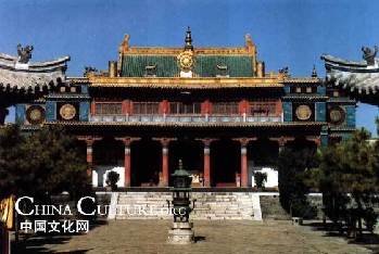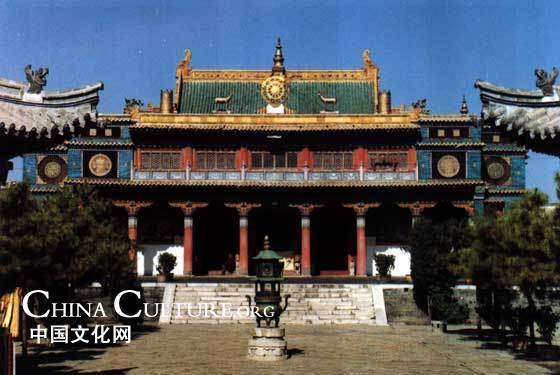 Its general plane is fully of a Han style, seating north and facing south. Multiple courtyards are arranged in accordance with the symmetrical axial style, and arranged from the front to the back are archways and temple doors. Inside the gate are east and west bell and drum towers, and Han-styled Buddhist halls and large scripture halls. In the southeast, in front of the large scripture hall, is a Lamaist pagoda, adding much luster to the front courtyard. With regard to single structures, except for the large scripture hall which serves as the heart of the whole temple and is of a Tibetan/Han mixed style and the Lamaist pagoda of Tibetan style, all other structures are of a pure Han style.