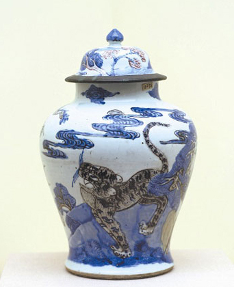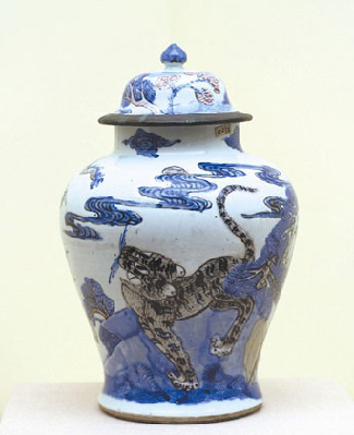 This kind of pot is called “Jiangjunguan,” which means “pot of the general,” because the lid looks like a general’s helmet from the Qing Dynasty. The pot body is vividly painted with a dragon and tiger design in blue and white glaze, red glaze and pea green glaze. It shows that the strong tiger was still appreciated when agriculture, handicrafts and commerce flourished in Chinese society.