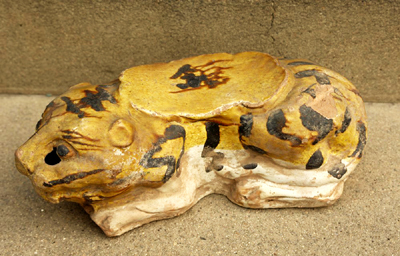 This pillow is molded in the shape of a crouching tiger, with the head, tail and limbs forming the outline of the pillow. The body is covered with amber-orange and white glaze, which, in turn, is painted with lively black stripes imparting a natural look and rhythmic flare.