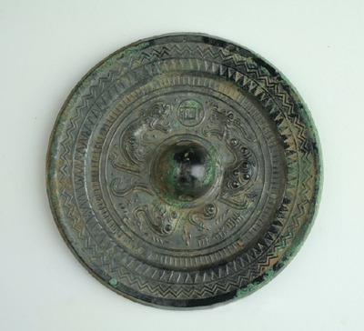 This mirror reflects that ancient people believed the tiger would protect their families from evil. The bronze mirror has a spherical knob on a round base. Above the knob are a dragon and a tiger arranged face to face. Below the knob is an inscription with three characters: “Huang Yang Zuo.” A saw pattern and double-lined wave pattern adorn the rim. This thick and heavy mirror has a pleasing covering of black patina.