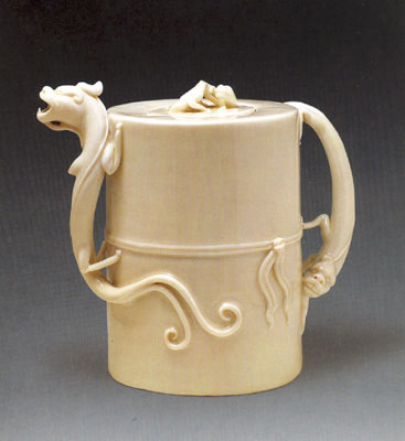 This pot has three dragons decorating its pure body. Its mouth is shaped like a flying baby dragon, the cap is adorned with a crouching dragon, and the third dragon is hunched over, interestingly enough, to become the handle of the pot.