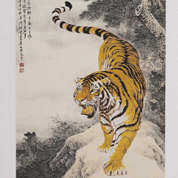 Uphill tiger paintings: the Tiger was commonly drawn in a pose that depicting it rising up. It was decorated with pine branches and moon, seemed peaceful and far-reaching without incident.