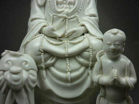 His works identified by his seal are in an entirely different category than the usual Dehua statuary of the period and those later. They are thickly potted and exhibit an artistic expressiveness and creativity unmatched by thinner and standardized unsigned works. He Chaozong and the few other artists of the Dehua kilns were nearly unique in Chinese ceramic history, which was characterized by anonymous and industrial scale production. Blumenfield, in his Blanc de Chine, presents the reader with what may be one of the few believable examples of the artist, replete with a hidden inscription visible to ultraviolet light.