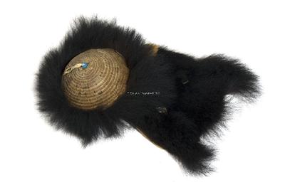 This is a piece of garment worn by Luoba men. The hat has a ring made of cane as its bone frame and bear fur with bear hair circling around its hem. With a piece of bear-fur cloth hanging at the rear, the hat looks like thick hair when seen from a distance. Some sub-groups attach two pig fangs to the forepart of a hat, while others may prefer having feathers on top of their hats for decoration. The hat keeps the head warm and helps lure the prey, but more importantly, it protects the head from animal or human attacks.
