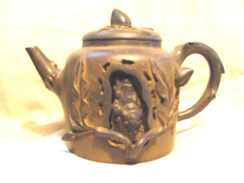 This teapot was created at the end of Qing Dynasty. The color on the teapot looks like the tea-flake glaze in the teapot. One side is a hole with a Taoist inside. There are many peach trees, peach blossoms and peach leaves on the pot body. There are also some moiré lines on the others side. The inscription on the bottom says “Icy Heart Taoist”.