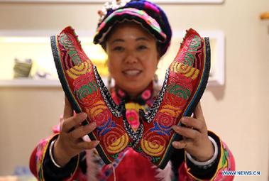 A woman of Qiang ethnic group shows a pair of shoes with unique Qiang embroidery patterns at an exbihition hall in Chengdu, capital of southwest China's Sichuan Province, March 2, 2012. The Qiang ethnic minority, with a history of more than 3,000 years, is one of the original ethnic groups in China. The traditional Qiang embroidery has been listed as one of the national intangible cultural heritages. However, the Qiang culture suffered from severe destruction after the devastating earthquake in 2008, which left a total of 87,000 people dead or missing and millions homeless. To revive the endangered Qiang embroidery became an important part of local government's post-disaster reconstruction program. With support of a women's organization in Aba, a training school was set up to teach local women the Qiang embroidery skills for free. Women also benefited from more than 30 workstations in many counties in Aba, which offered instruction to them on the embroidery business as well as production. All these efforts have helped the Qiang embroidery get effective salvation and protection. (Xinhua/Xue Yubin)